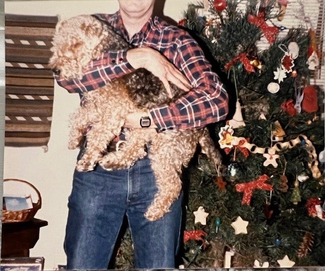 No. Actually—and I remember this quite well—I was trying to get a picture of only Higgins. I hadn’t wanted my dad in the photo at all! But Higgins was still a relatively young pup—about three years old—and wouldn’t stay still, so I’d asked someone to hold him so I could take a picture. This wasn’t what I had in mind, but it’s what I got. I remember thinking that if I could just zero in on Higgins when I took the picture, no one would even see my dad. 🤣